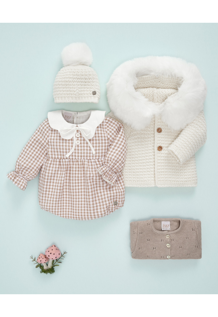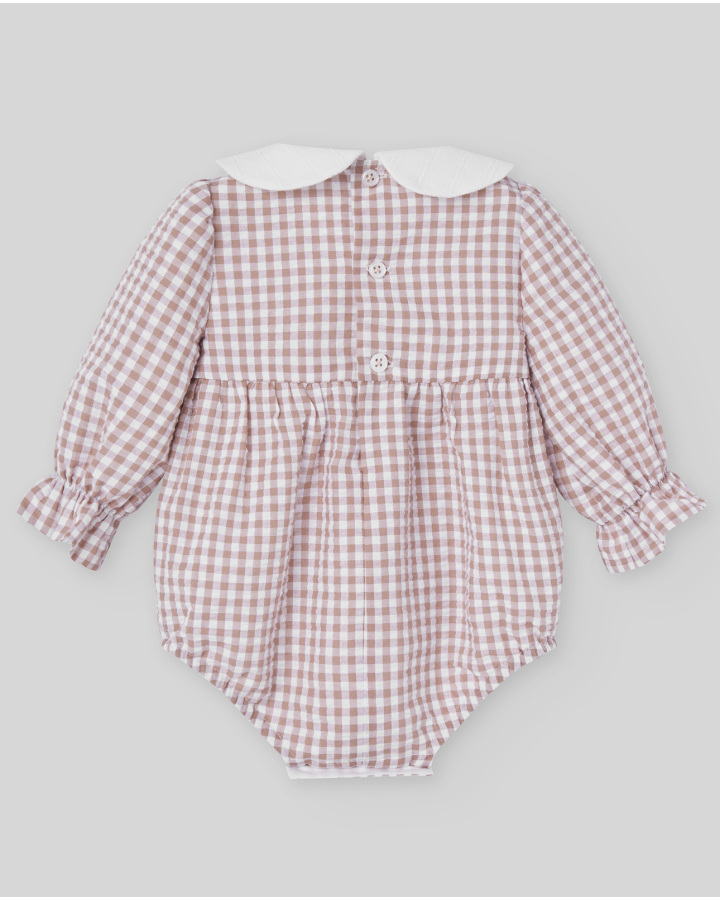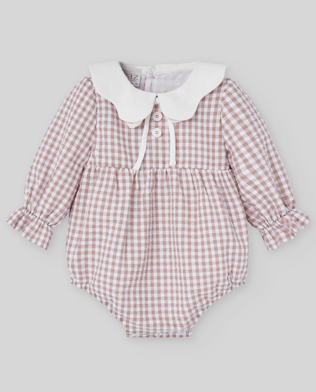 Fofo em tecido vichy de tom bege. Gola decorativa em branco.